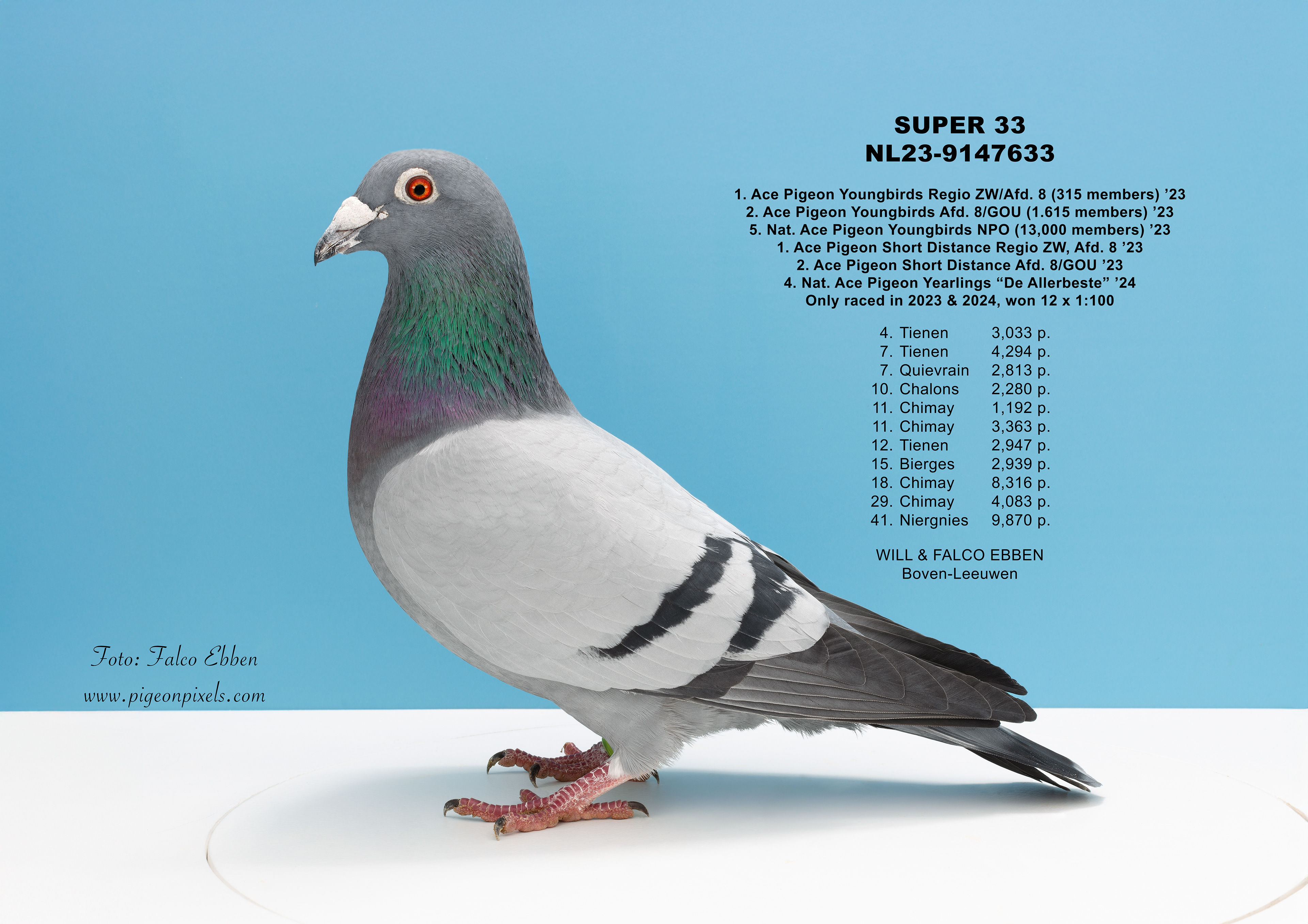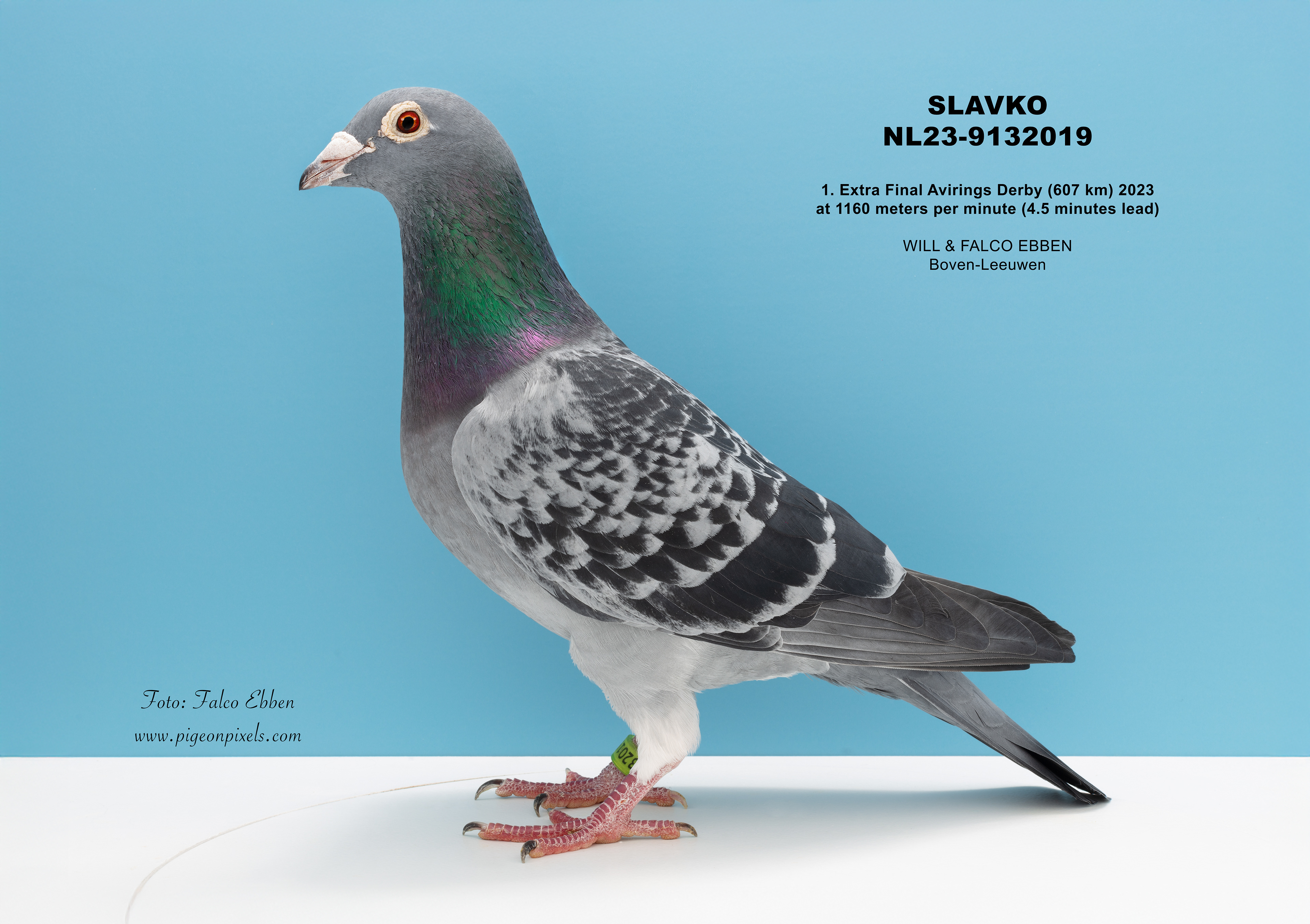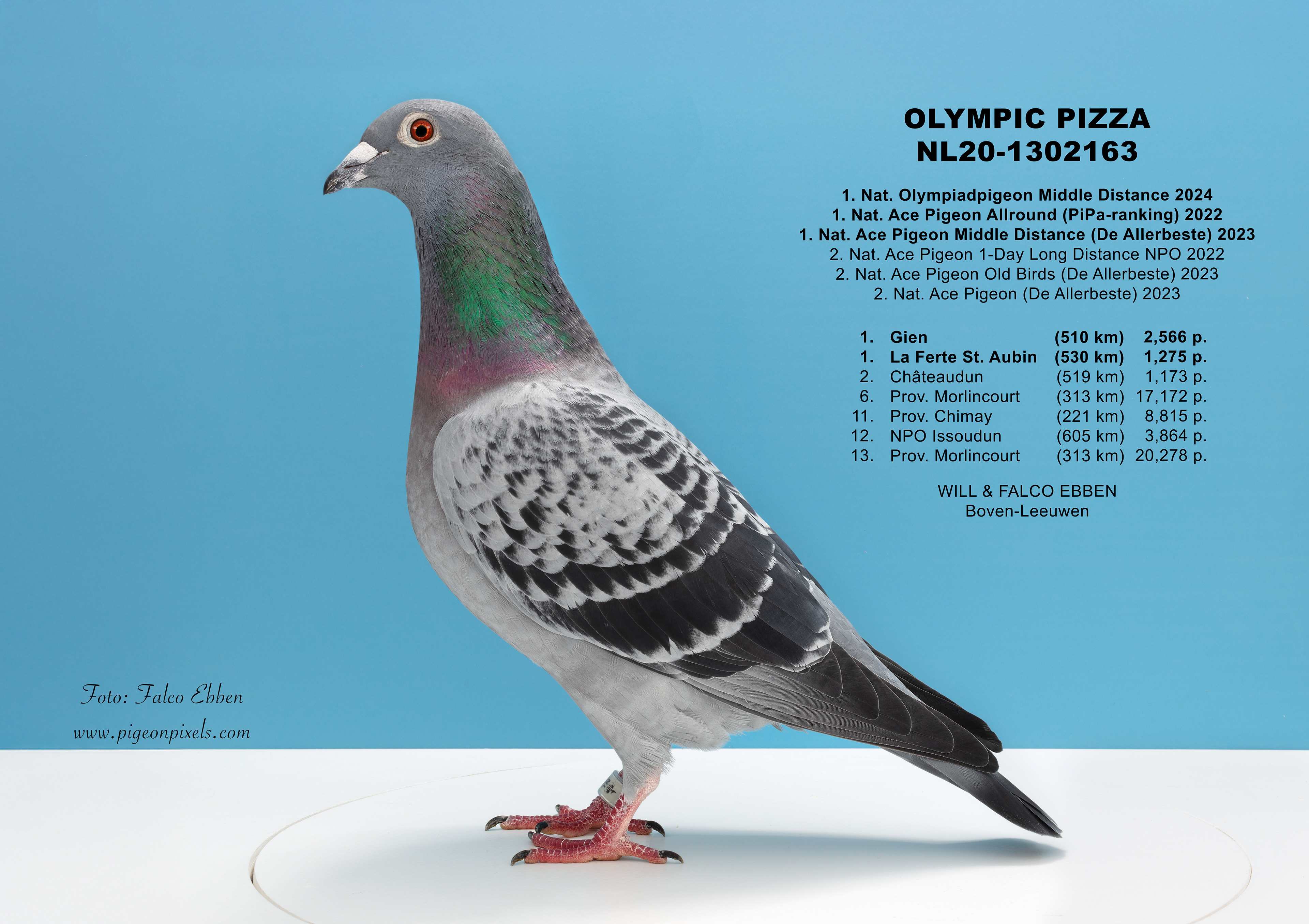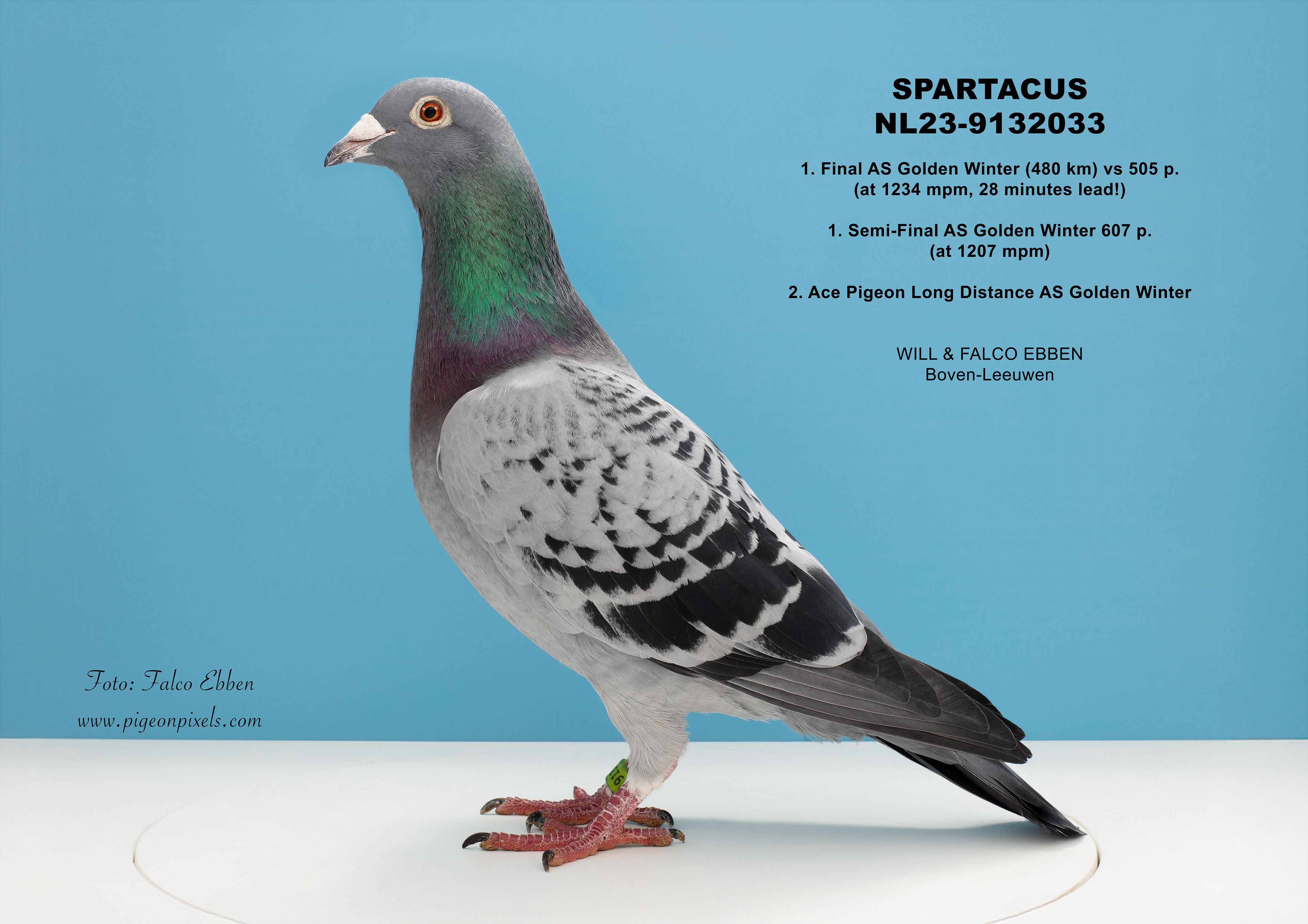 Deze foto’s zijn gemaakt in een studio, maar zonder het uitknippen, vervormen of standaardiseren dat binnen de duivenfotografie inmiddels de norm is geworden. De duif wordt niet in een mal geplaatst en digitaal aangepast, maar gefotografeerd zoals hij daadwerkelijk voor de camera staat.