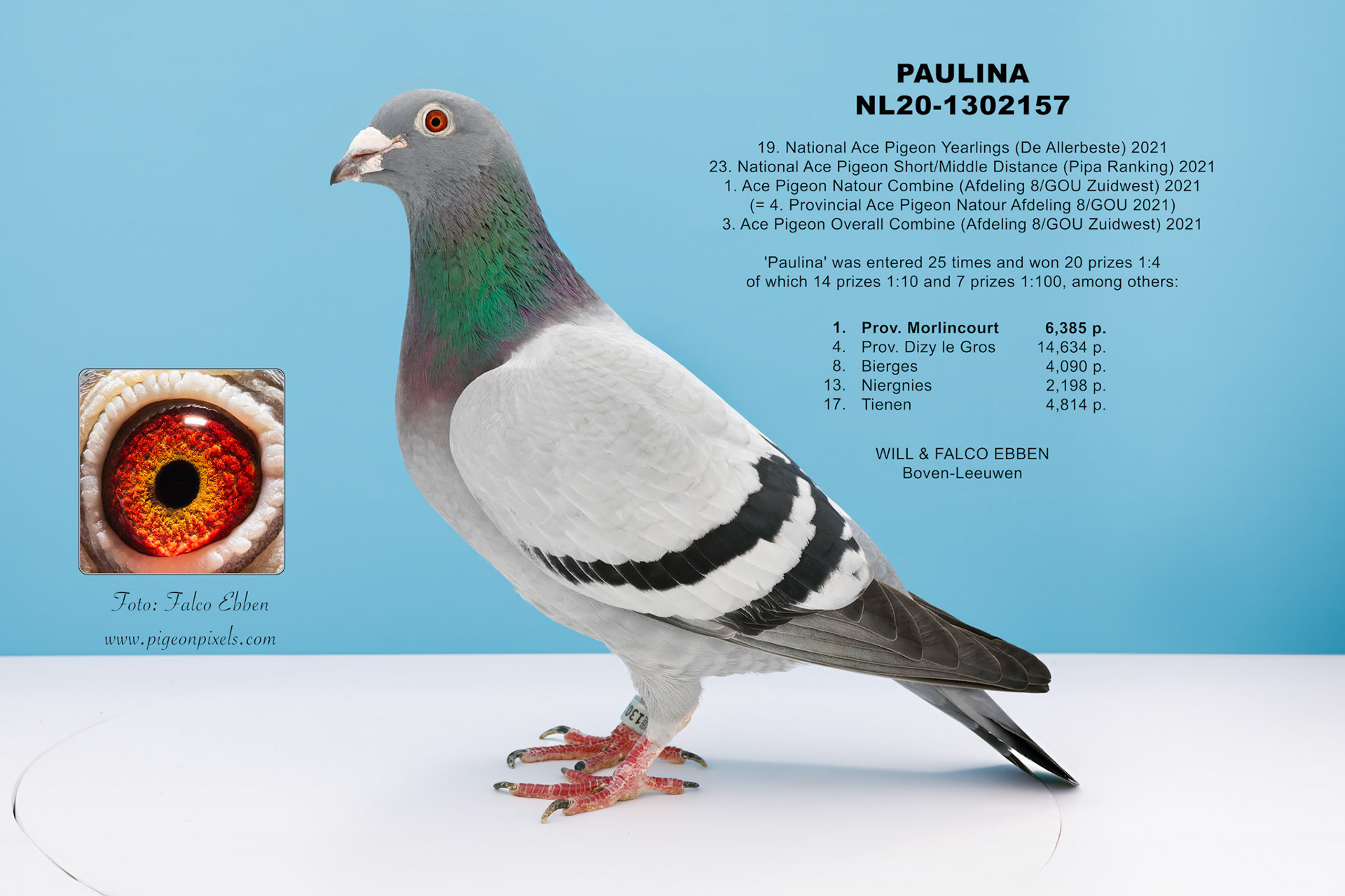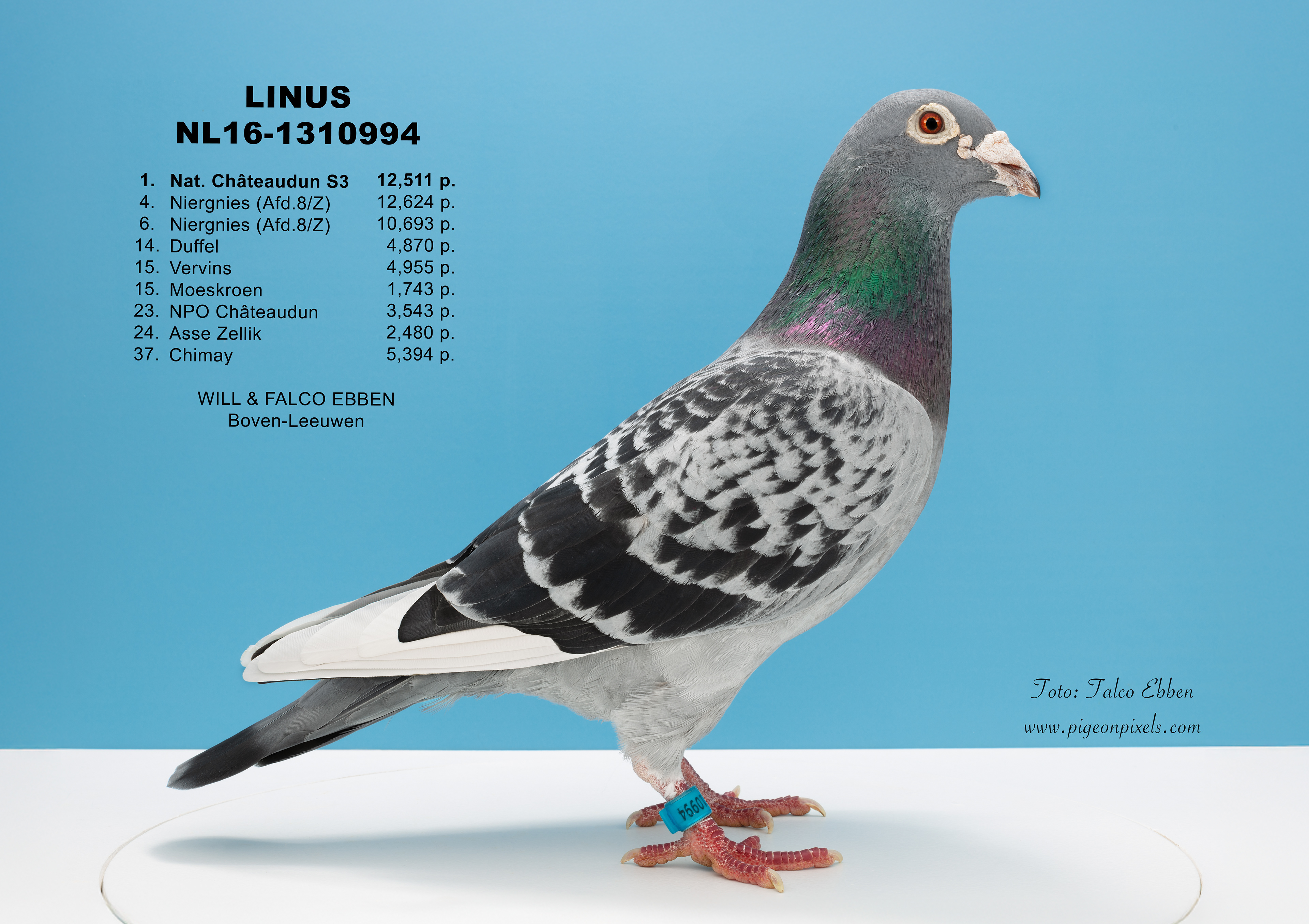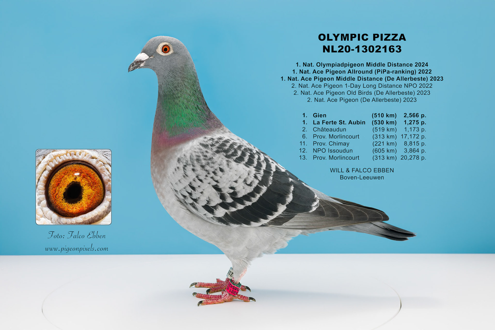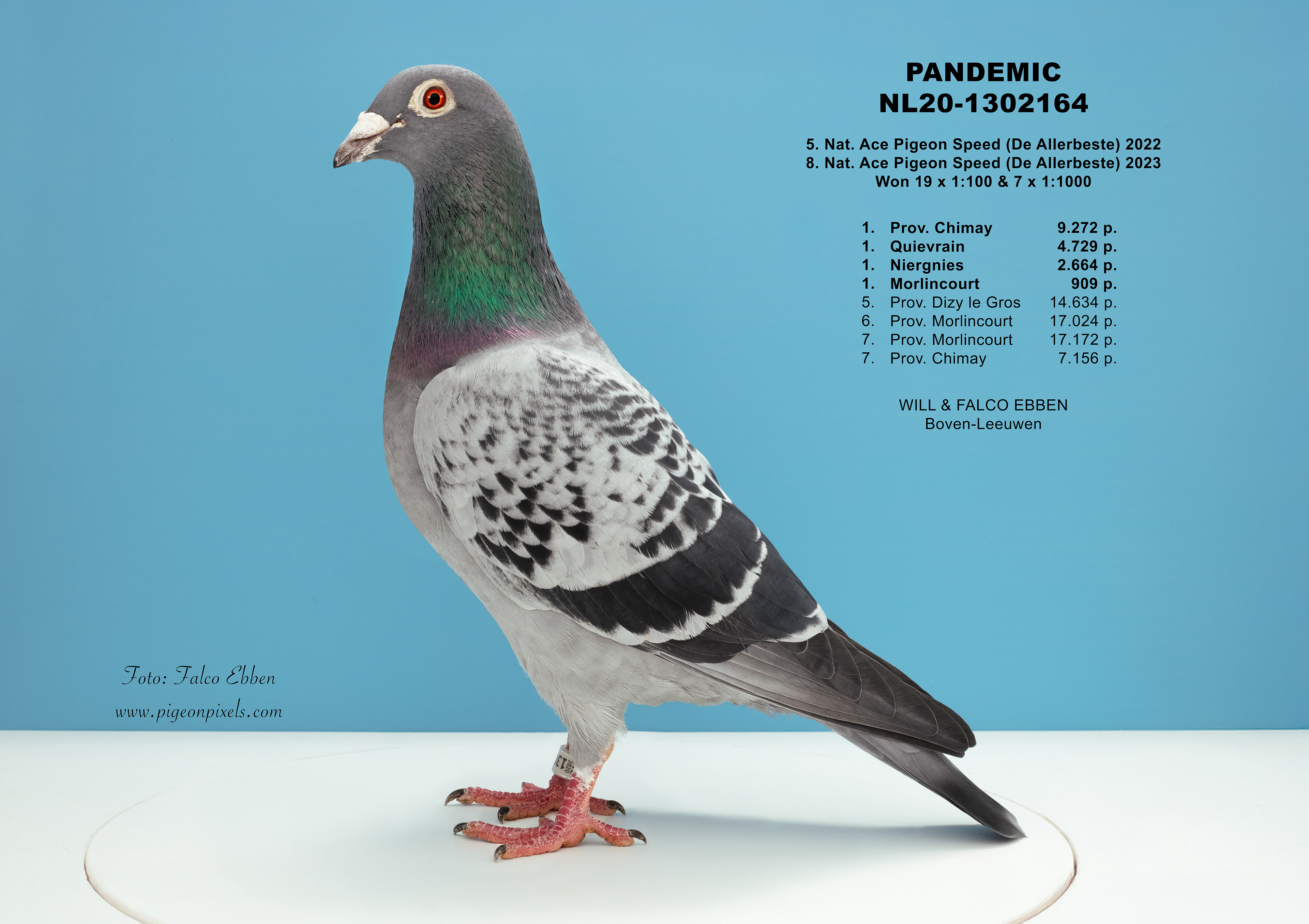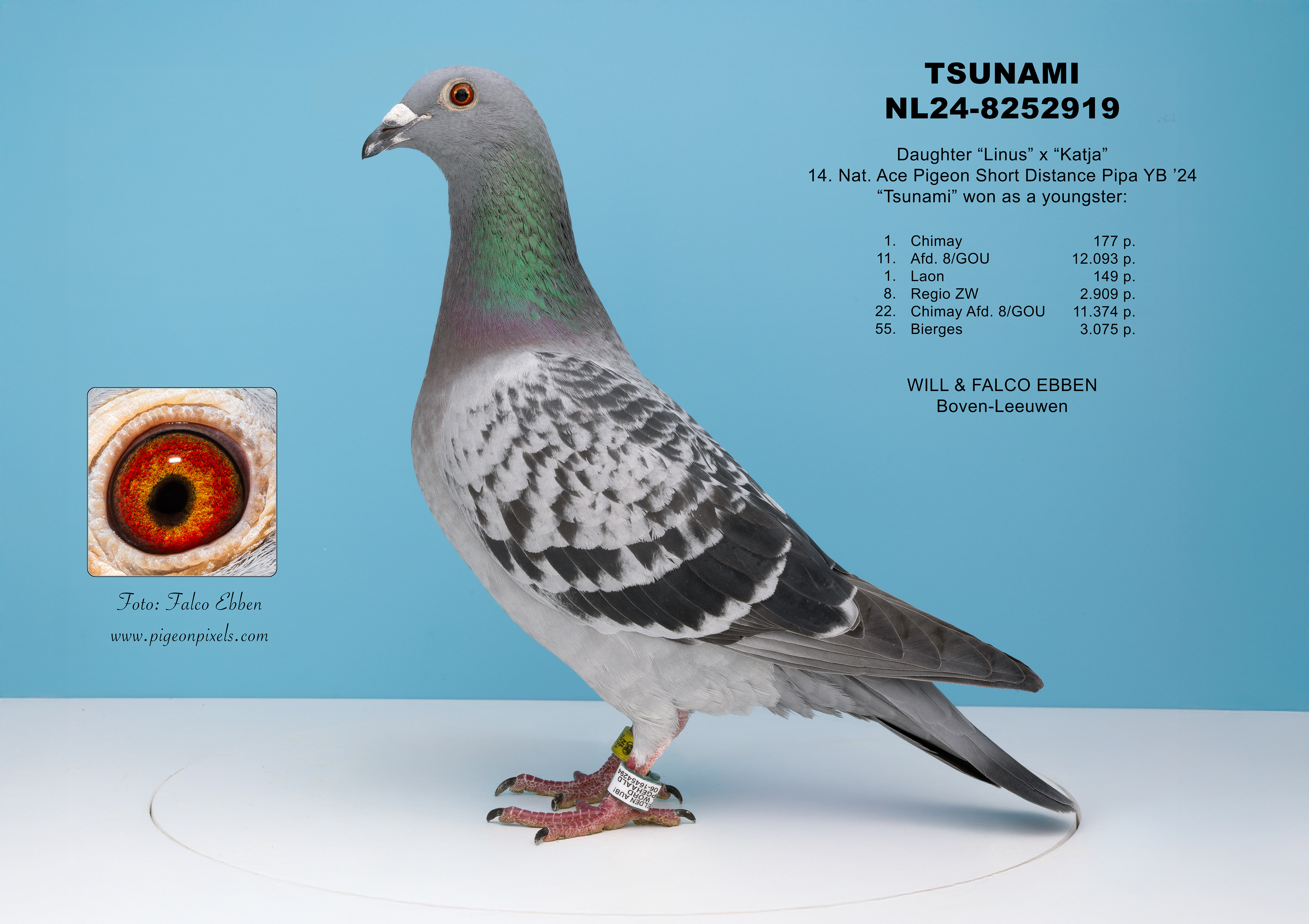 Deze foto’s zijn gemaakt in een studio, maar zonder het uitknippen, vervormen of standaardiseren dat binnen de duivenfotografie inmiddels de norm is geworden. De duif wordt niet in een mal geplaatst en digitaal aangepast, maar gefotografeerd zoals hij daadwerkelijk voor de camera staat.